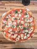Our Marinara Sauce, Fresh Mozzarella Cheese, EVOO, Parmesan Cheese & lastly Basil.