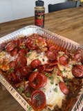 Cheese Pizza topped with a tray of Char Pepperoni and topped with our delicious Aioli