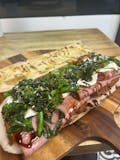 20 oz. thin sliced steak, sautéed onions and green peppers and American cheese. Our delicious home-made garlic knots.